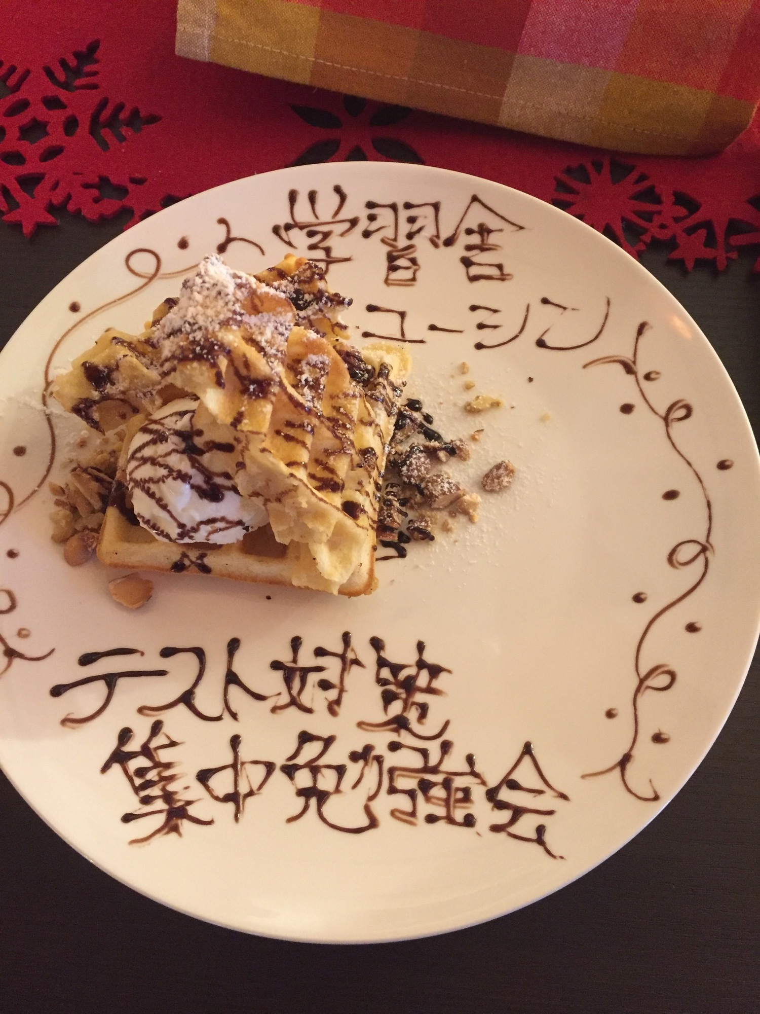 そのワッフルのお皿にチョコで書いてくださいました!!!!!