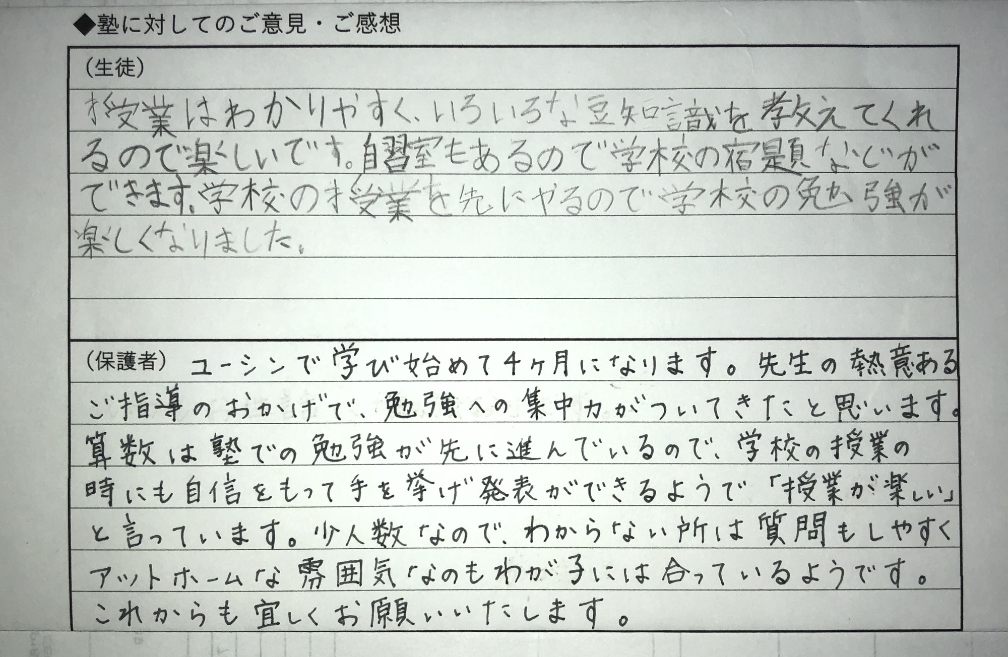 - ユーシンで学び始めて4ヶ月になります。先生の熱意あるご指導のおかげで、勉強への集中力がついてきたと思います。算数は塾での勉強が先に進んでいるので、学校の授業の時にも自信をもって手を挙げ発表ができるようで「授業が楽しい」と言っています。少人数なので、わからない所は質問もしやすくアットホームな雰囲気なのもわが子には合っているようです。これからも宜しくお願いいたします。