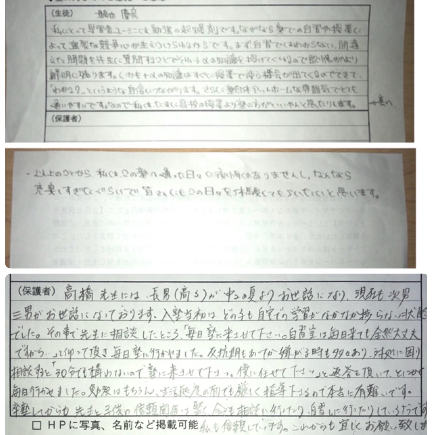 - 髙橋先生には長男(高3)が中2の夏よりお世話になり、現在次男、三男もお世話になっております。入塾当初はどの子も自宅での学習がなかなか捗らない状態でした。その事で先生に相談したところ、「毎日塾に来させて下さい。自習室は毎日来ても全然大丈夫ですから」と仰って頂き、毎日塾に行かせました。反抗期もあってか嫌がる時も多々あり、対処に困り相談すると「30分でも構わないので塾に来させて下さい。僕に任せて下さい」と返答を頂いて、とにかく毎日行かせました。勉強はもちろん生活態度の面でも厳しく指導下さるので本当に有難いです。卒塾してからも先生と子どもの信頼関係は堅く、今でも相談に行ったり、自習しに行ったりしているようです。私も信頼しています。これからも宜しくお願い致します。